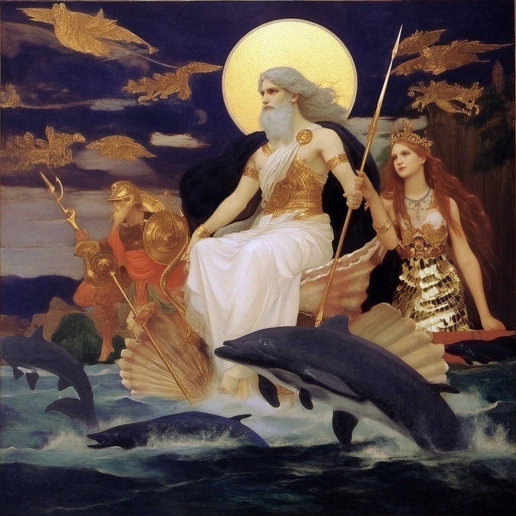 A number of supernatural ocean-dwelling beings who visited the host and Thomas Olney at the Strange High House in the Mist. Chief among then was Nodens, Lord of the Great Abyss. He rode in a shell upon dolphins’ backs and was accompanied by trident-bearing Neptune, sportive tritons playing conches, and fantastic nereids beating on shells. Nodens took the host and Olney for a ride with the Mighty Ones, and thereafter Olney appeared to have left his soul, or at least his imagination, behind with them. [HPL Mist (online text)]
